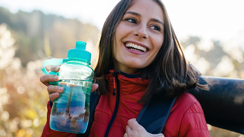 When you’re hiking this summer, carry a lot of water. You should drink at least a quart every two hours to avoid dehydration.