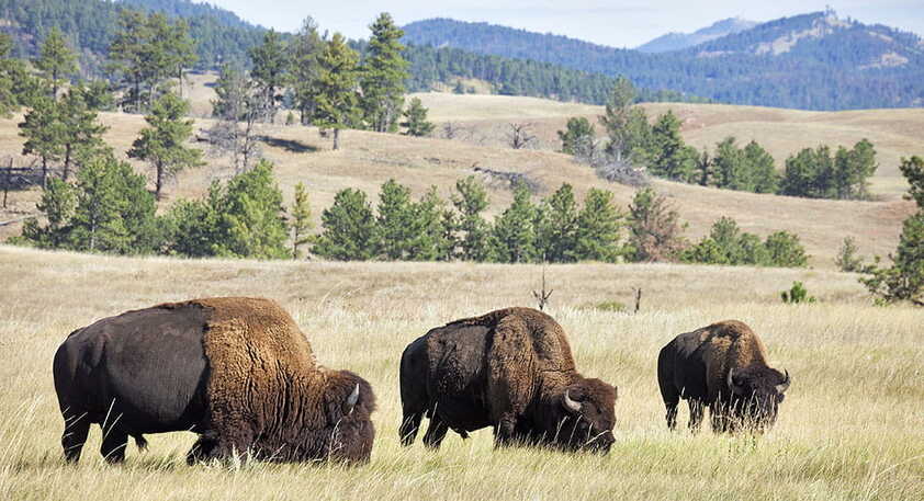 From Sylvan Lake, the Needles Highway (Hwy. 87) leads into Custer State Park, winding and squeezing among dramatic rock spires situated barely wide enough apart for a vehicle. The 18-mile Wildlife Loop circles through the heart of the vast 71,000-acre park. More than 1,000 bison—along with pronghorn, mule deer, elk and other natives of the plains—roam across an unbroken landscape of red rock and golden grasslands, offering a glimpse back in time.
